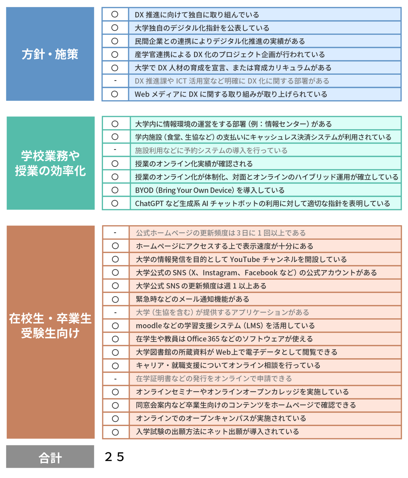 DX化として重要な観点となるユーザー側、大学では学生向けの取り組みで、今回は在学生だけでなく、卒業生や受験生への取り組みも含めて評価しました。証明書類の申請やオープンキャンパスのオンライン化など、大学に関わる人々がよりよく過ごせるような取り組みがなされているかを考慮しています。