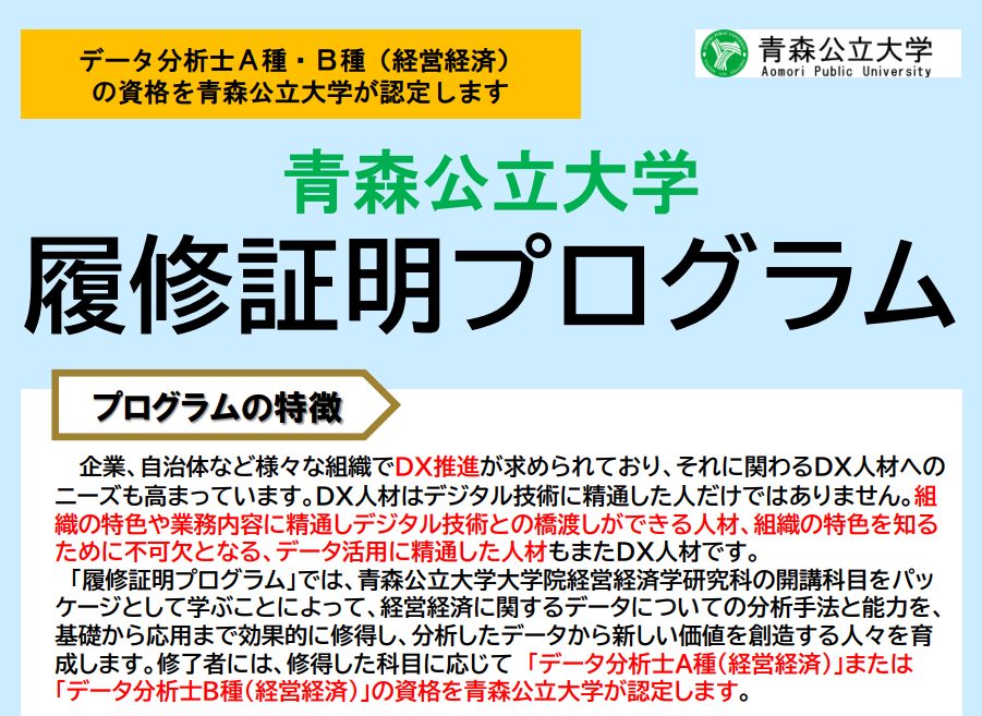 同プログラムでは、青森公立大学大学院経営経済学研究科の開講科目をパッケージとして学ぶことができ、修了者には履修科目に応じて「データ分析士A種(経営経済)」または「データ分析士B種(経営経済)」の資格が同学より認定されます。