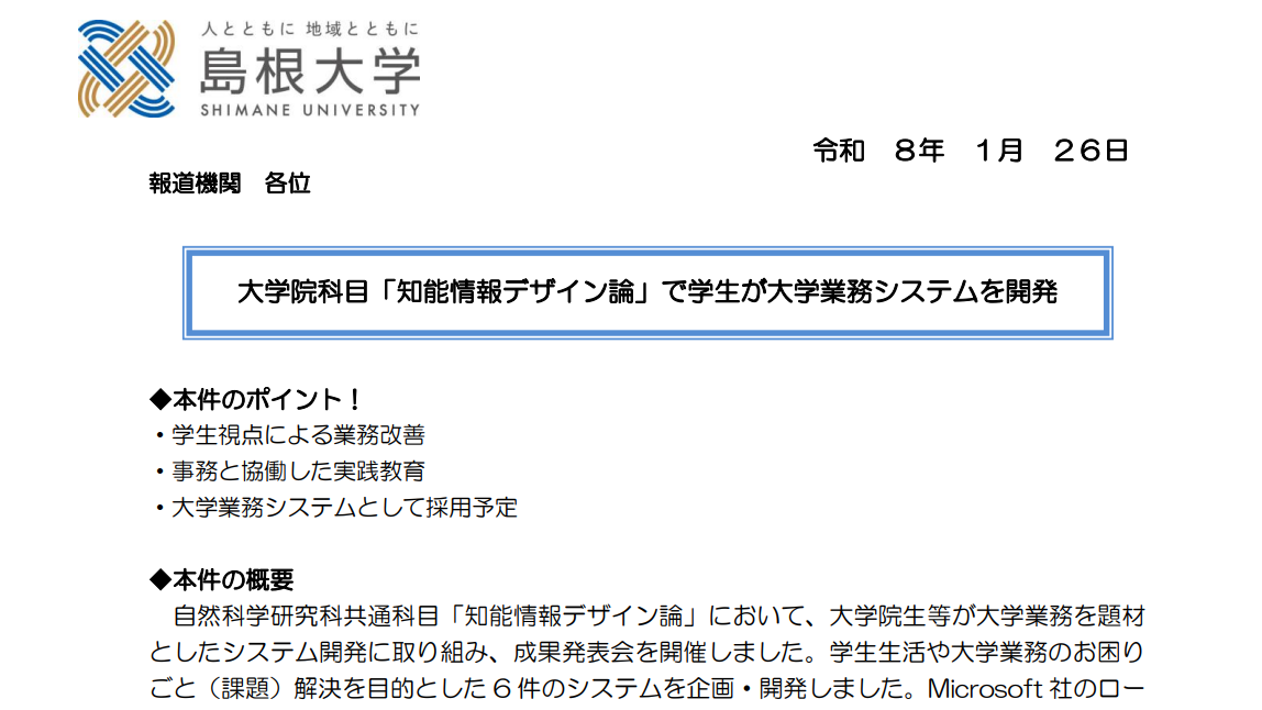 参考サイト:島根大学「大学院科目「知能情報デザイン論」で学生が大学業務システムを開発しました